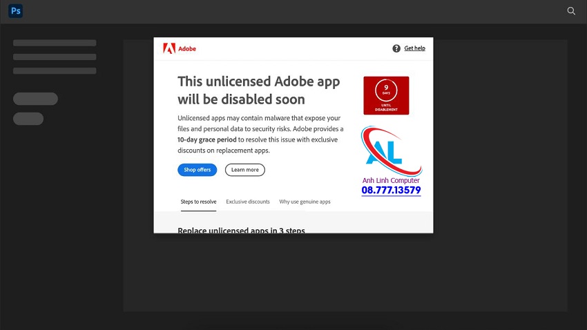 Thông báo “This unlicensed Adobe app will be disabled soon” thường xuất hiện khi bạn sử dụng phần mềm Adobe không có bản quyền. Khi phần mềm nhận diện vấn đề này, hệ thống sẽ yêu cầu bạn mua bản quyền để tiếp tục sử dụng. Nếu bạn không mua bản quyền, bạn chỉ có 10 ngày sử dụng trước khi phần mềm bị chặn hoàn toàn.